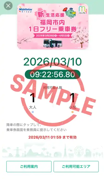 期間限定で、「my route」内で使用できる『西鉄バス 福岡市内1日フリー乗車券』を300円で販売するもの。 |