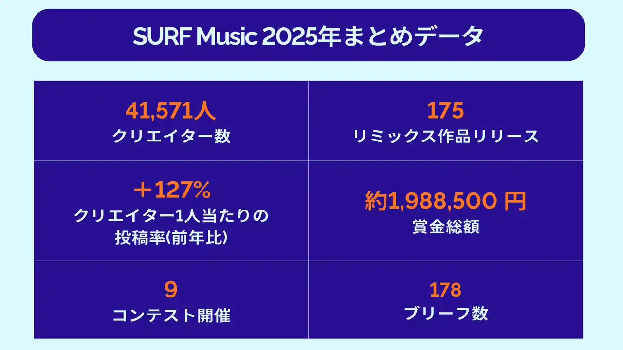 | さらに、SURF Musicを通じて制作された175曲のリミックス作品が公式リリースされるなど、クリエイターのキャリア形成にもつながるプラットフォームとして存在感を高めています。 | ||||||||||