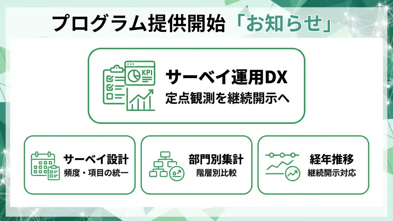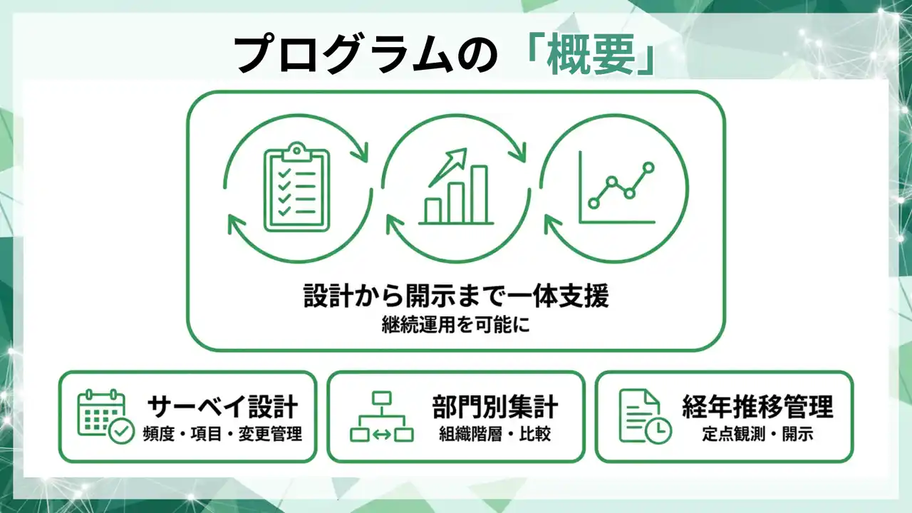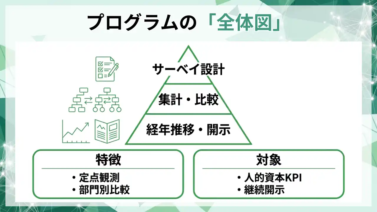 本プログラムは、従業員サーベイを定点観測の仕組みに変え、人的資本KPIの運用を継続開示に耐える状態へ整備します。 |