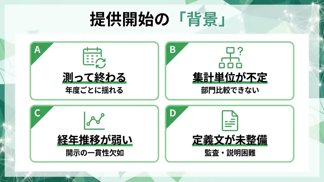 サーベイ頻度や項目が年度ごとに揺れる、集計単位が定まらず部門比較ができない、経年推移の管理が弱く開示の一貫性が担保できない、監査や社内説明に必要な定義文が整備されていない、といった課題が発生します。 |