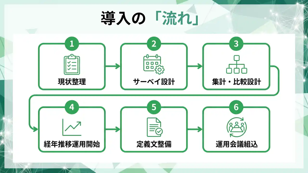 サーベイ設計(頻度・項目)から組織階層での集計、経年推移の管理、レポート出力、監査・説明に必要な定義文テンプレまでを整備し、年次の集計で終わらないKPI運用へ移行します。 |