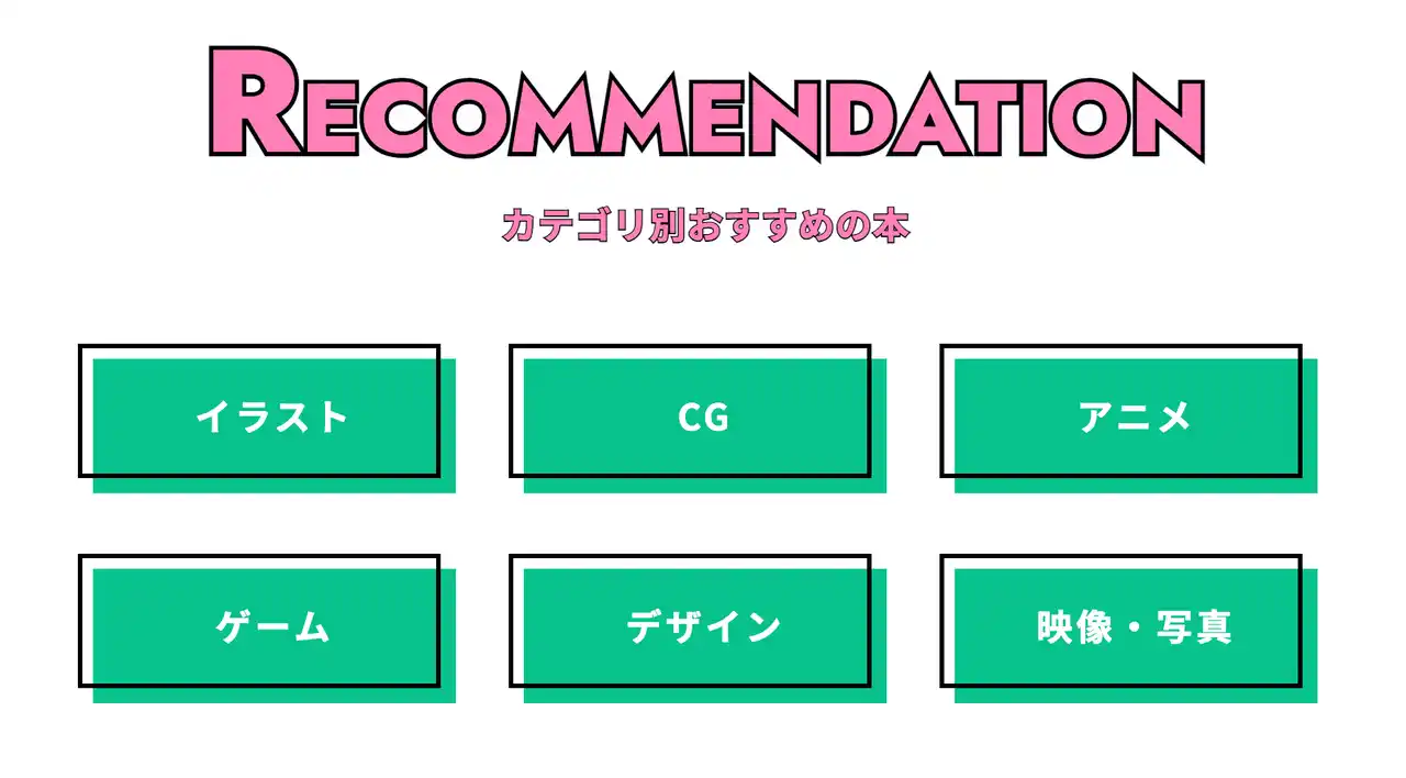 イベントサイトでは、ジャンル別の各社おすすめ本も掲載。イラスト、CG、アニメ、ゲーム、デザイン、映像・写真の6ジャンルで、本を紹介しています。 |