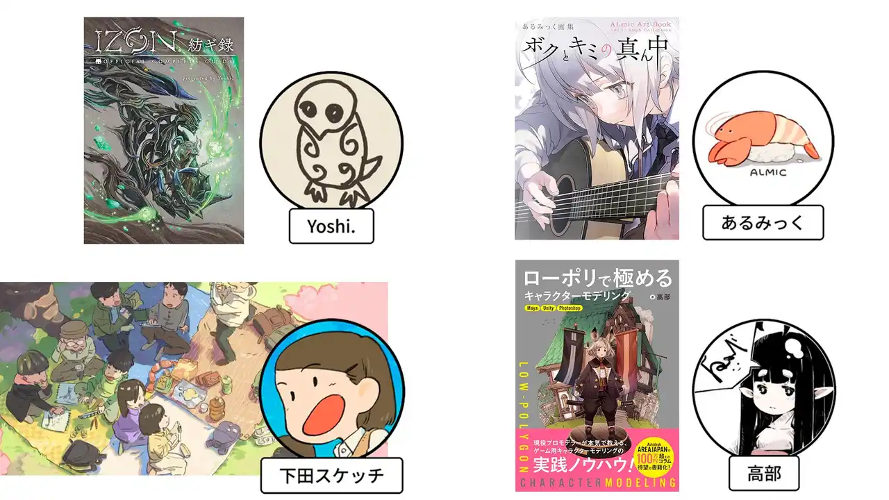 前回スケッチ会で大人気だった下田スケッチ氏、人気イラストレーターのあるみっく氏、共依存アドベンチャーゲーム『IZON.』の公式設定資料集「IZON.紡ギ録」著者・Yoshi.氏、クリエイターの間で話題の本「ローポリで極めるキャラクターモデリング」の著者・高部氏が登壇します。 ※どの回も無料でご参加いただけます。 |
