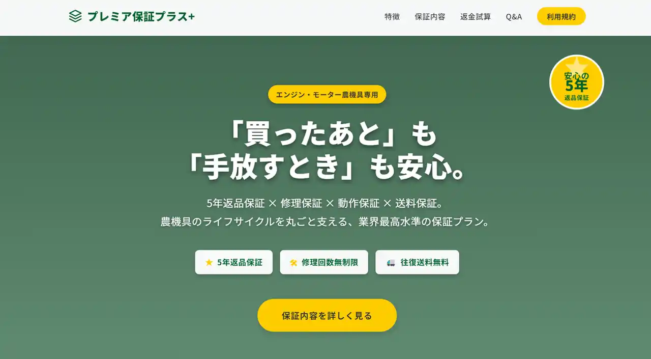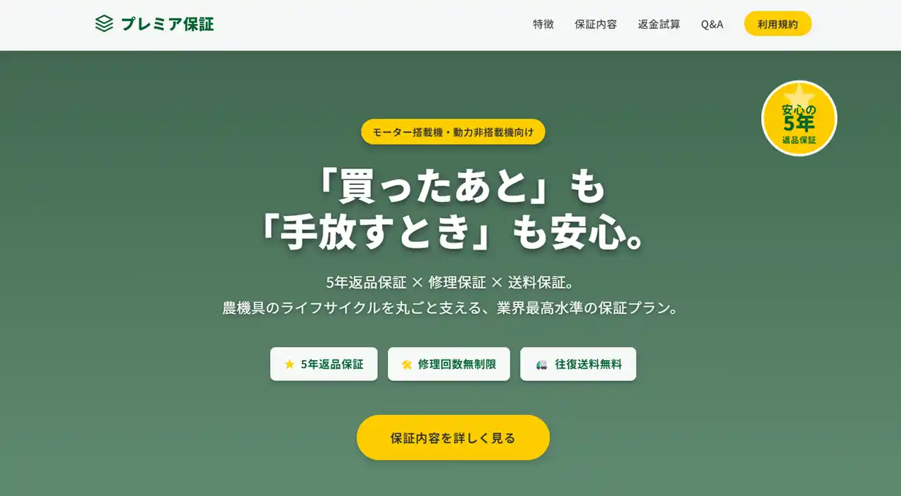 株式会社GROWLAND(本社:和歌山県日高郡みなべ町)(以下:グローランド)が運営する農業機械通販サイト「アグリズ」は、独自の保証サービス「プレミア保証」「プレミア保証プラス」をリニューアルし、返品保証期間を5年へ延長しました。 |