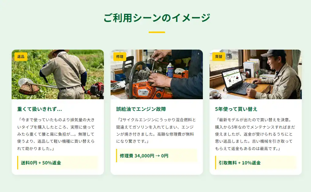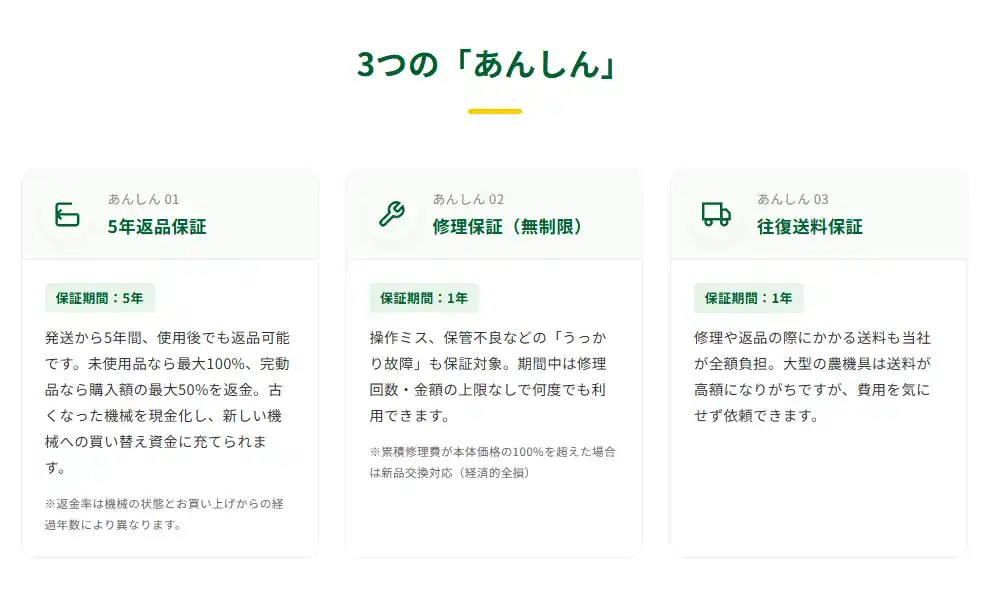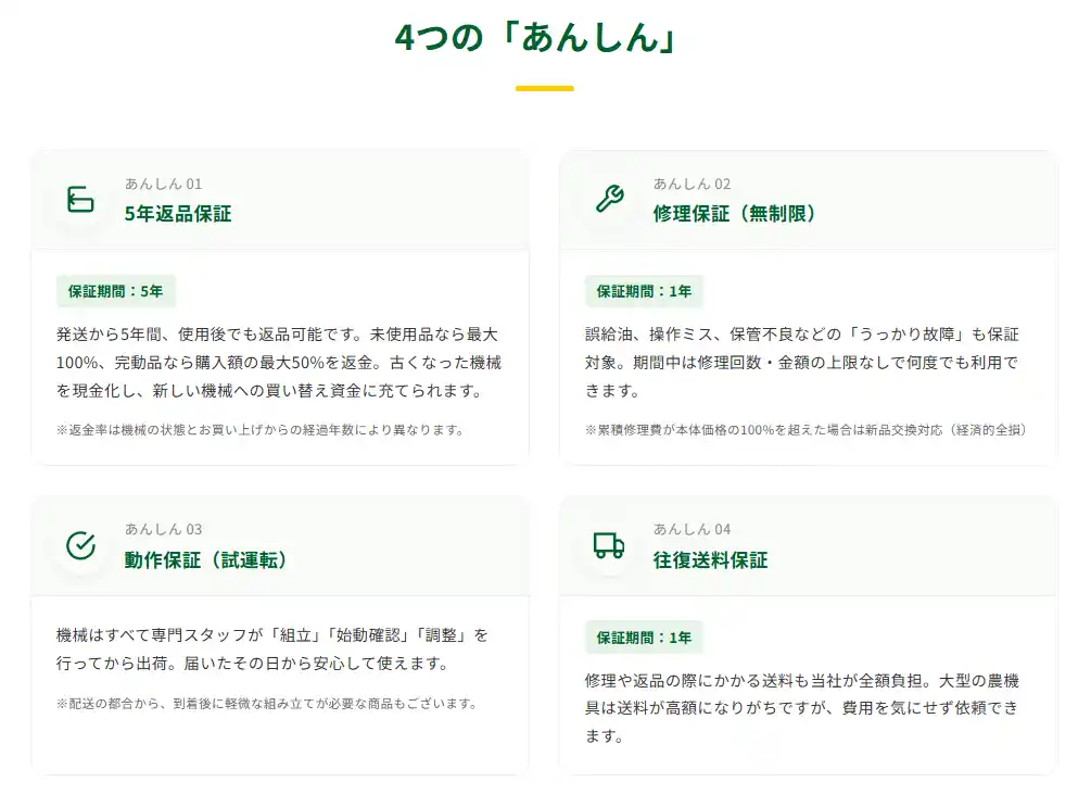 特にネット通販では実機を確認してから購入することが難しいため、「購入後に思っていた機械と違った」というリスクを感じる農業者も少なくありません。こうした課題に対応するため、アグリズでは購入後の安心を支える保証サービスを提供しています。 |