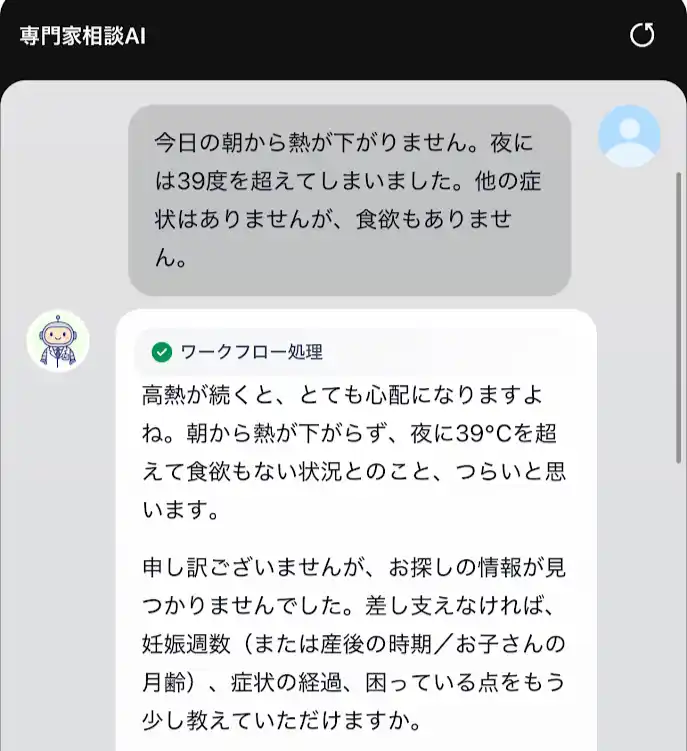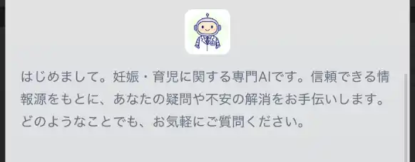 『専門家相談AI』は、そうした不安や疑問に寄り添いながら、専門家監修の情報をもとに安心して参考にできる回答を提供することを目指して開発された機能です。妊娠中の体調の変化や赤ちゃんのお世話、日々の小さな疑問まで、いつでも気軽に相談できる存在としてご活用いただけます。 |