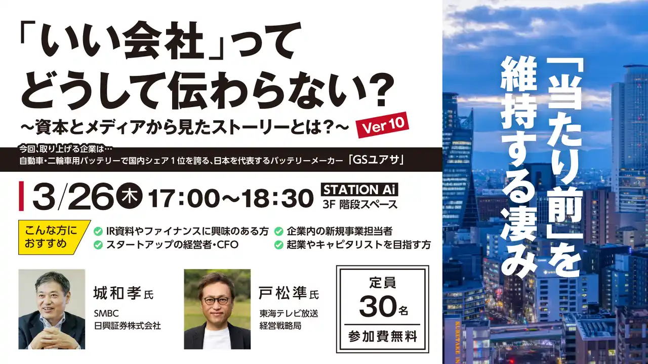東海テレビ放送株式会社(本社:名古屋市東区)は、2026年3月26日(火)にSTATION Ai(愛知県名古屋市昭和区鶴舞1丁目2番32号)にて、SMBC日興証券株式会社とのコラボイベント【「いい会社」ってどうして伝わらない?~資本とメディアから見たストーリーとは?~】第10弾を開催いたします。 |