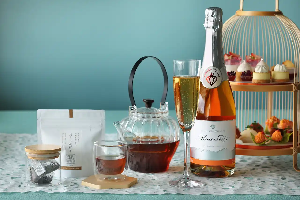 ミガキイチゴのスパークリングワインとほうじ和紅茶 |