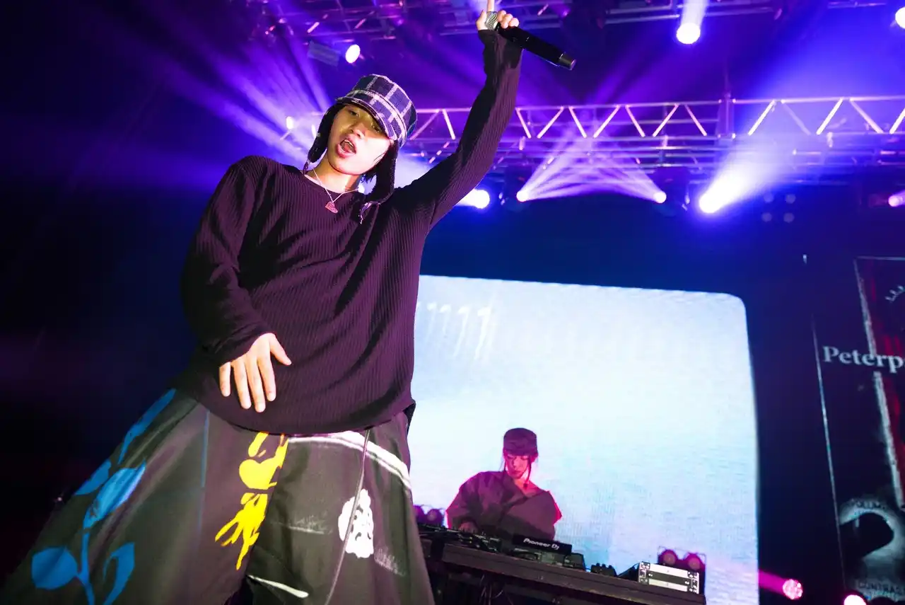 一組目はPeterparker69。軽やかなステップでJeterがステージに現れると、エレクトロニックなビートに乗って観客が一斉に跳ね始める。「music」からスタートしたパフォーマンスで、フロアの笑顔も弾け飛ぶ。「loloi」から「loloi - Aamourocean Remix」へとダンサブルに変貌していくビートが、会場の熱を一気に引き上げていく。「今日、俺は楽しみに来たから。皆も楽しもう!」と話すJeterは、いつも以上にくだけた表情。「fallpoi」や「cu」、「Monkey See」といった人気曲が続き、終盤の「Hey phone」「@location」ではバックにMVが流れる中、軽快なラップを畳みかける。MCではファンとの親密なやり取りも見せ、スター性あふれるライブに熱気は高まるばかりだ。 |