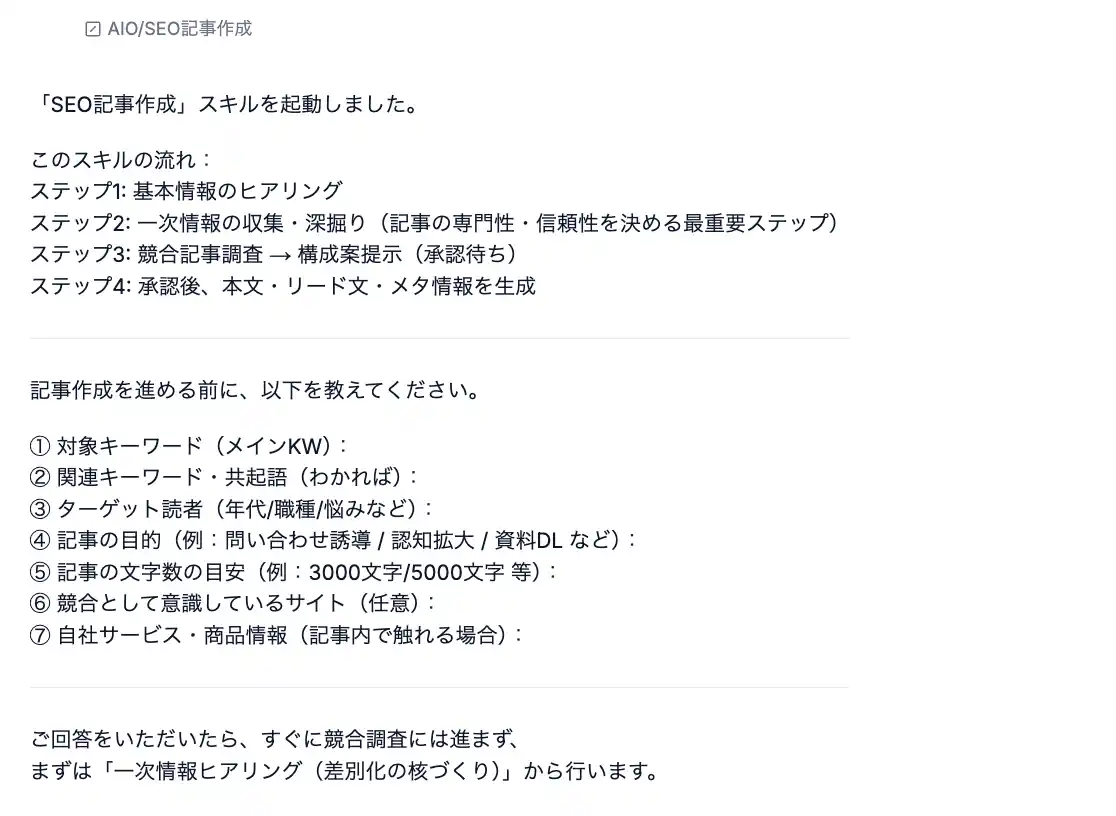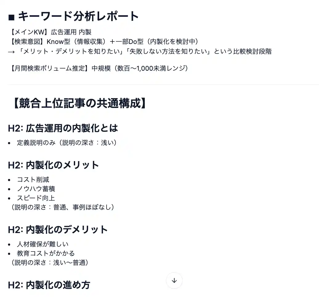 | 専門的なSEO知識がなくても、AIが「どのキーワードをどこに配置すべきか」「読者の検索意図に応えるにはどんな構成が適切か」といった判断を担うため、コンテンツ担当者は本来の「何を伝えたいか」に集中できます。 | ||||||||||||||||||||||||
