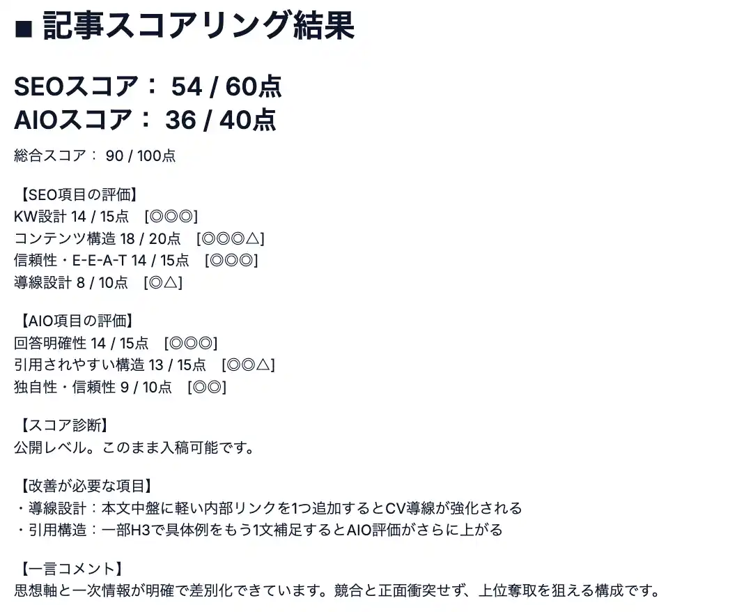 | AIとの会話を重ねるだけで、検索エンジン・AI検索(AIO)の双方に最適化された記事が完成します。仕上げには自動スコアリングが実施され、客観的な品質評価に基づくブラッシュアップが可能です。 | ||||||||||||||||||||||||