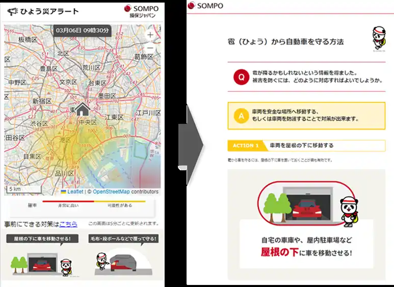 | 契約住所における降雹リスクが高まった際に、リスク度合いに応じて「注意」または「警戒」のアラートを配信します。メッセージ内のリンクからは、降雹予測の地図画面や、具体的な対策方法(車両の退避や保護の方法)を確認することができます。 | |||
