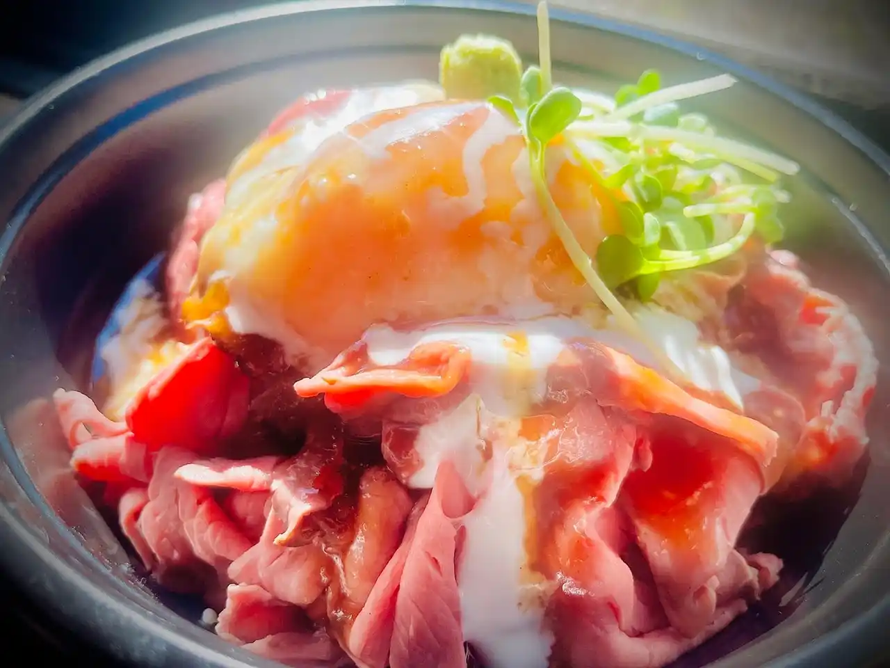 低温調理で柔らかく仕上げたローストビーフに温泉卵が絡む贅沢なローストビーフ丼が楽しめます。自家製グレイビーと爽やかなサワークリームオニオンが旨みを引き立てます。 |