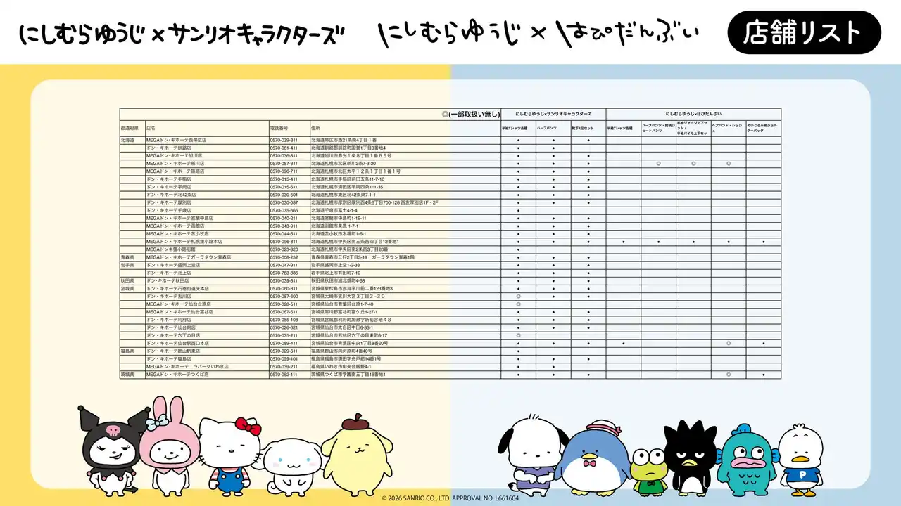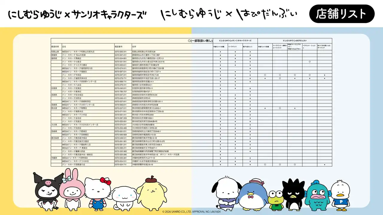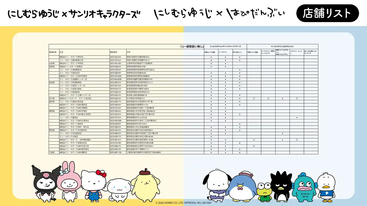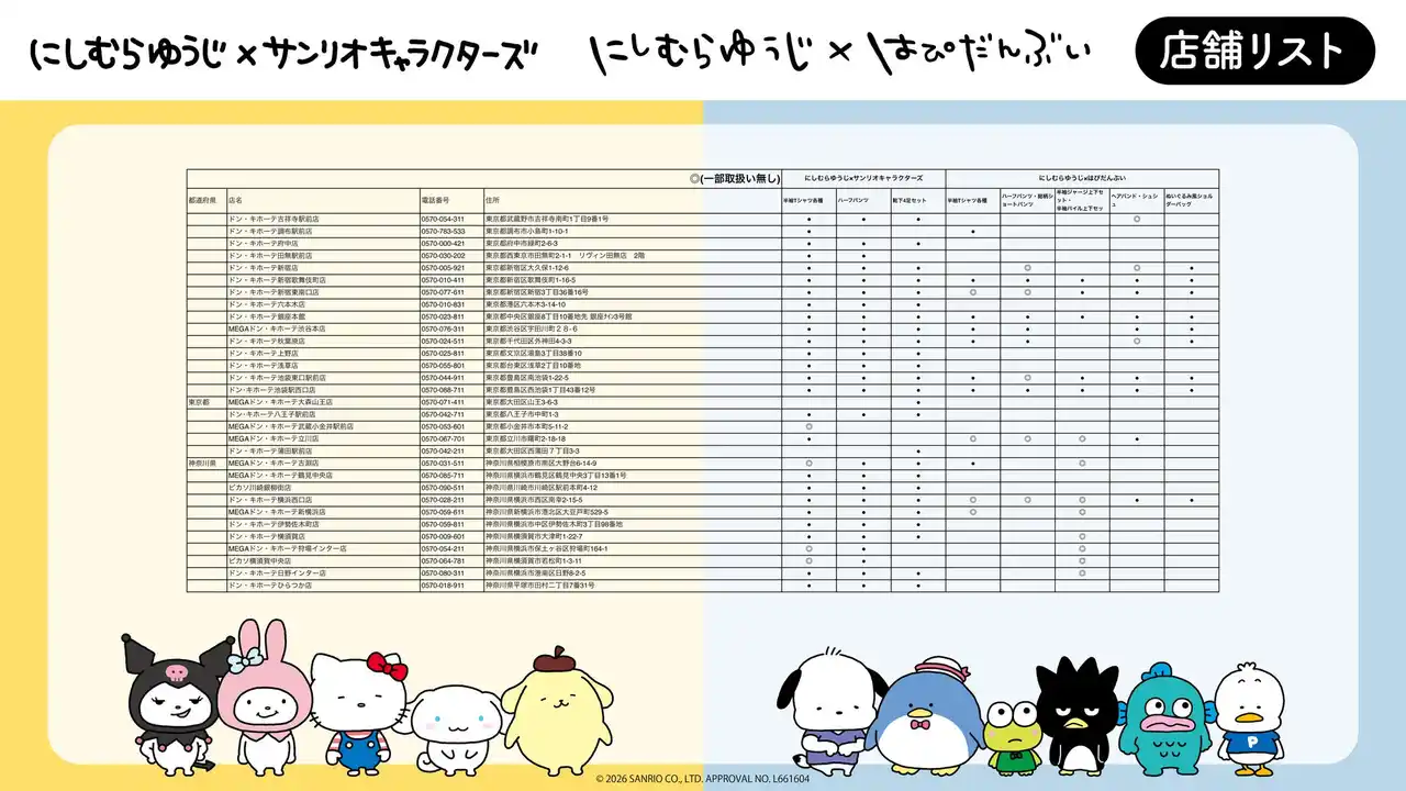 「にしむらゆうじ×サンリオキャラクターズ」コラボアイテムを全国のドン・キホーテ、アピタでゲットして、かわいいがいっぱいの毎日をお過ごしください(ハート) |