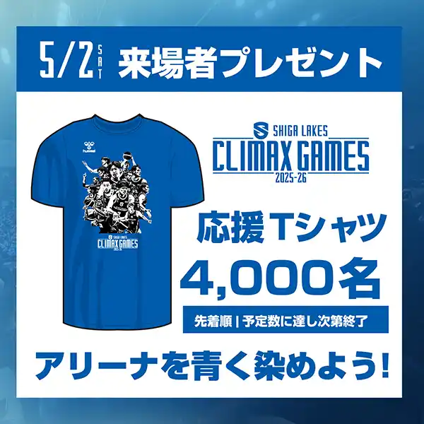 プロバスケットボール「B.LEAGUE」のB1リーグ西地区に所属する滋賀レイクスは、2025-26シーズンを締めくくる4月と5月のホームゲーム残り5節7試合を、圧倒的ホームコートアドバンテージを作り出して、一つでも多くの勝利をブースターの皆様とともに勝ち取るべく「CLIMAX GAMES 2025-26(クライマックス ゲームズ)」として実施いたします。 |
