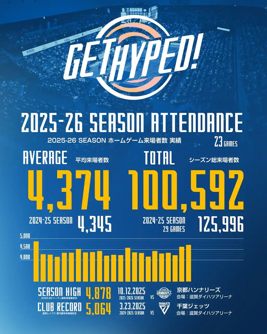 滋賀レイクスのホームゲームは、3月までの23試合を終えた時点で総来場者数10万人に到達。平均来場者数は過去最高だった昨シーズン(4,345名)を上回るペースとなる4,374名(昨季比 +29名)となっている。 |