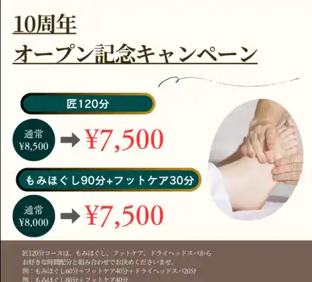 武蔵小金井店では匠120分コース、もみほぐし60分+フットケア30分コースを7,500円でご案内しております。