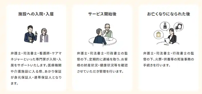 具体的には、身元保証、病院・施設の入居のサポート、具体的には、ご家族の代わりに入院・入居時に保証人になったりするだけでなく、ご家族の代わりに定期的に連絡をとり、健康状況等の確認、 |