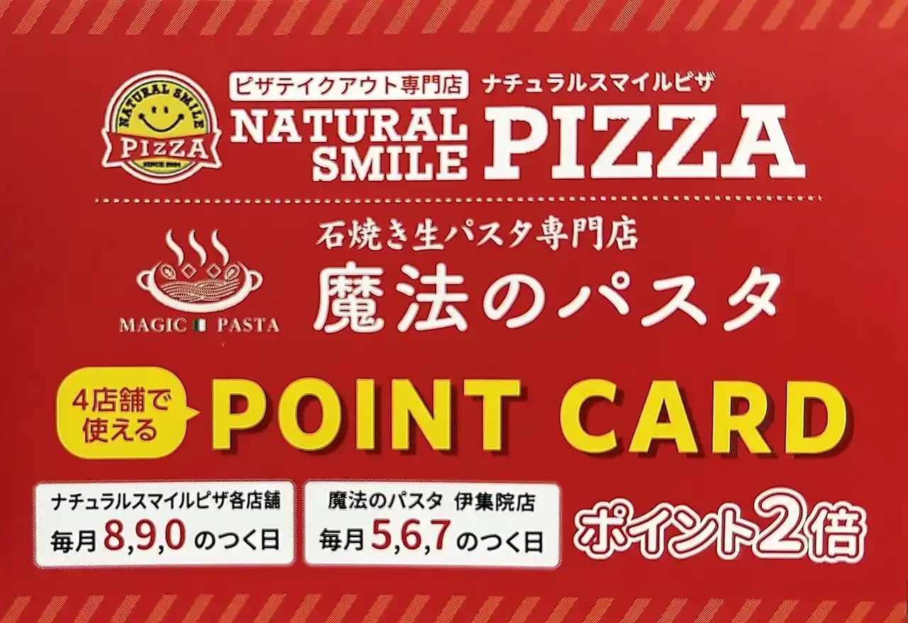 | 貯まったポイントは、ナチュラルスマイルピザ中山本店・武岡店・伊集院店、魔法のパスタ伊集院店の4店舗で共通して利用可能です。貯まったポイントは4店舗共通で利用可能。40ポイントでMサイズピザ1枚またはパスタ1品無料。普段のテイクアウト利用はもちろん、ご家族でのお食事や継続的なご利用にもつながる、分かりやすく使いやすいサービスとして展開しています。 | |||||||||||||