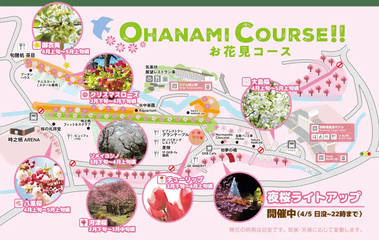 | ソメイヨシノや八重桜、チューリップやクリスマスローズ等、多種多様な花々が咲き誇る時之栖で春を感じつつ、美味しいグルメやクラフトビールに舌鼓。花も団子も思う存分お楽しみください! | ||||||||||||||