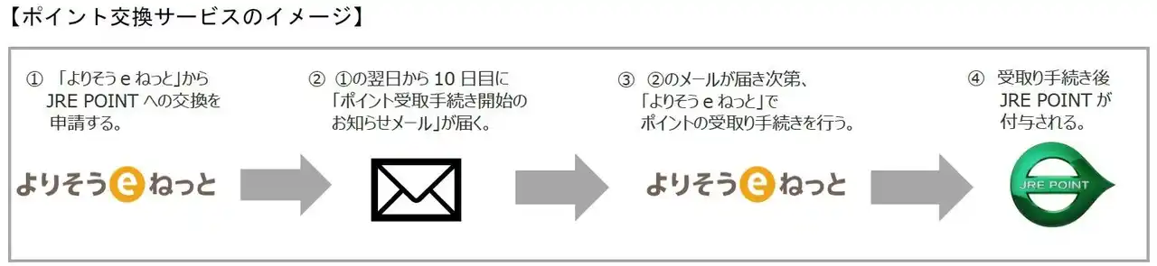 (1)開始日時 2026年3月16日(月)14時00分~ (2)対象 「よりそうeねっと」会員、かつ「JRE POINT」会員 (3)交換レート 「よりそうeポイント」1ポイント⇒「JRE POINT」1ポイント |