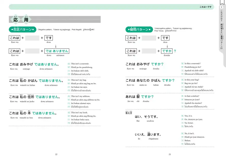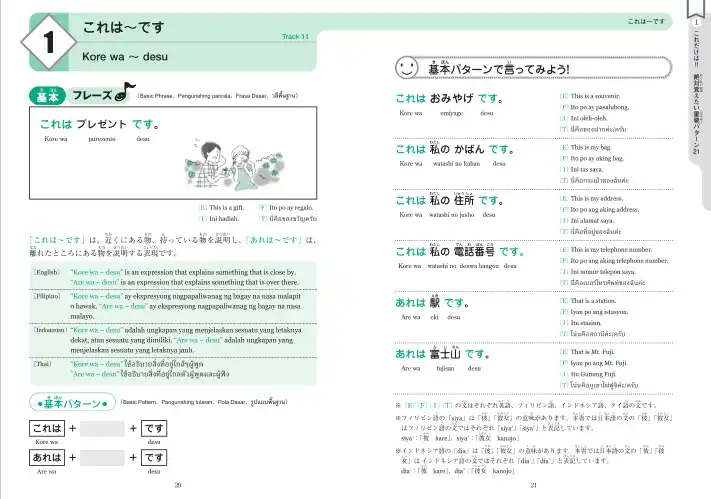 ・4言語の訳つき。パターン1~72の説明文、および会話フレーズに「英語、フィリピン語、インドネシア語、タイ語」の訳をつけています。 |