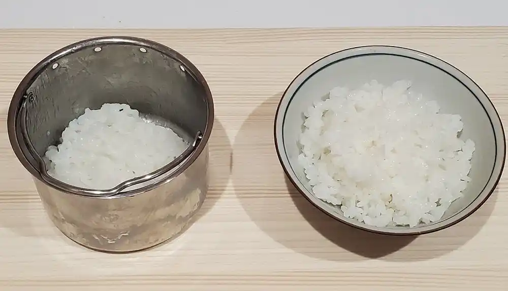 蒸し器に米を入れ、一部の糖分が溶けたお湯を蒸し器の下へ。低糖質ごはんも、毎回炊きたてを食べたい方に最適。 |