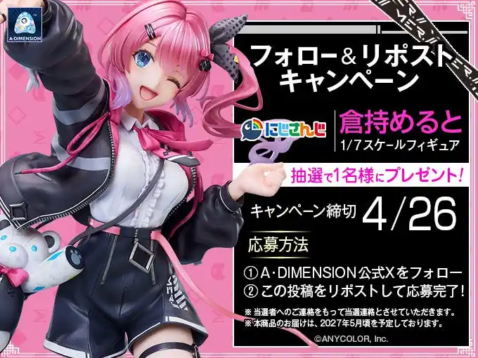 株式会社A・DIMENSION(Aディメンション)(本社:東京都台東区、代表取締役社長:上村篤)は、『にじさんじ 倉持めると 1/7スケールフィギュア』の発売を決定し、予約受付を2026年3月16日(月)20:30より開始いたします。予約締切は、2026年4月26日(日)23:59となります。 |