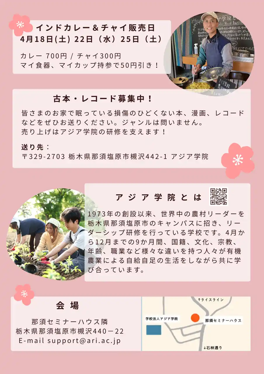 恒例の大人気イベント・古本市を、今年も開催いたします! 全国から寄贈されたベストセラーから文庫本、絵本、美術書などが100円~。アジア学院産の有機食材を使ったインドカレーとチャイも、3日間限定でご用意しています。みなさまのお越しをお待ちしております。 4/17(金)~25(土) 4/19(日)はお休みOPEN11:00~16:00 会場:那須セミナーハウス隣 インドカレー&チャイ販売:4/18(土)、22(水)、25(土)の3日間限定 カレー: 700円 チャイ: 300円 マイ食器ご持参で全てのメニューから50円引きです♪ 古本・レコード募集中!アジア学院までお送りください。古本市での売り上げは、アジア学院の研修プログラムのため、大切に使わせていただきます。 【Used Book Market Spring 2026】 The ARI Used Book Market will be held in this spring! Best sellers, paperbacks, picture books, art books, and many more, all donated from across Japan, will be available for 100 yen and up. We are looking forward to seeing you all! Fri, April 17 - Sat, 25 *Closed on Sun, April 19 OPEN11:00-16:00 Venue: Adjacent to Nasu Seminar House Indian Curry & Chai Sales April 18(Sat), 22(Wed), and 25 (Sat) Curry: 700 yen Chai: 300 yen |