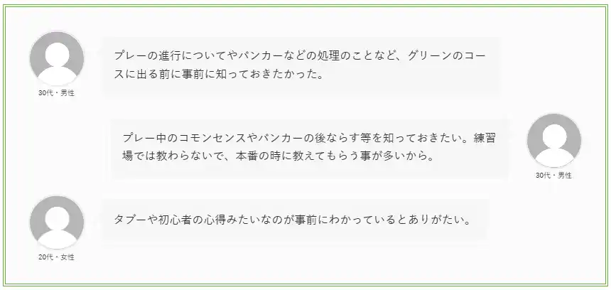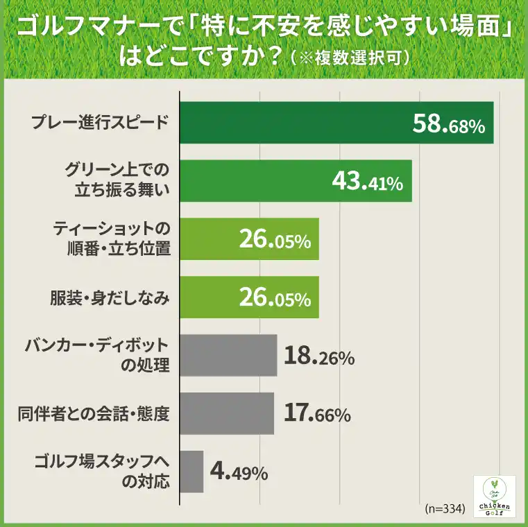 これらは一見すると基本的な項目ですが、ゴルフ場ごとにドレスコードが異なったり、ティーイングエリアでの立ち位置に明確なルールがあったりと、事前に知っていなければ対応しにくいマナーであることが、不安につながっていると推察されます。 |