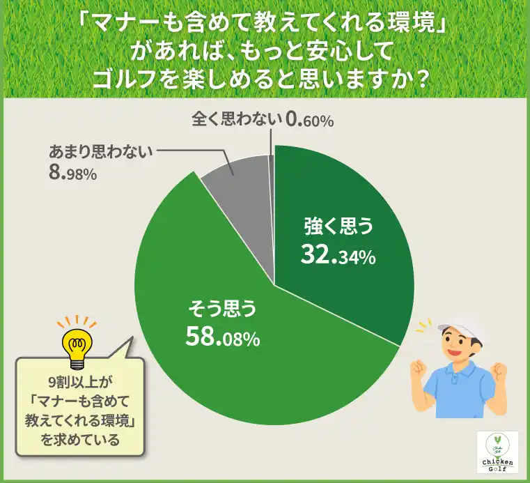 多くのゴルファーが技術面だけでなくマナー面も含めた総合的な学びの場を求めていることから、マナーも一緒に学べる環境の整備が、ゴルファーの不安解消とゴルフの楽しさの向上に直結すると考えられます。 |
