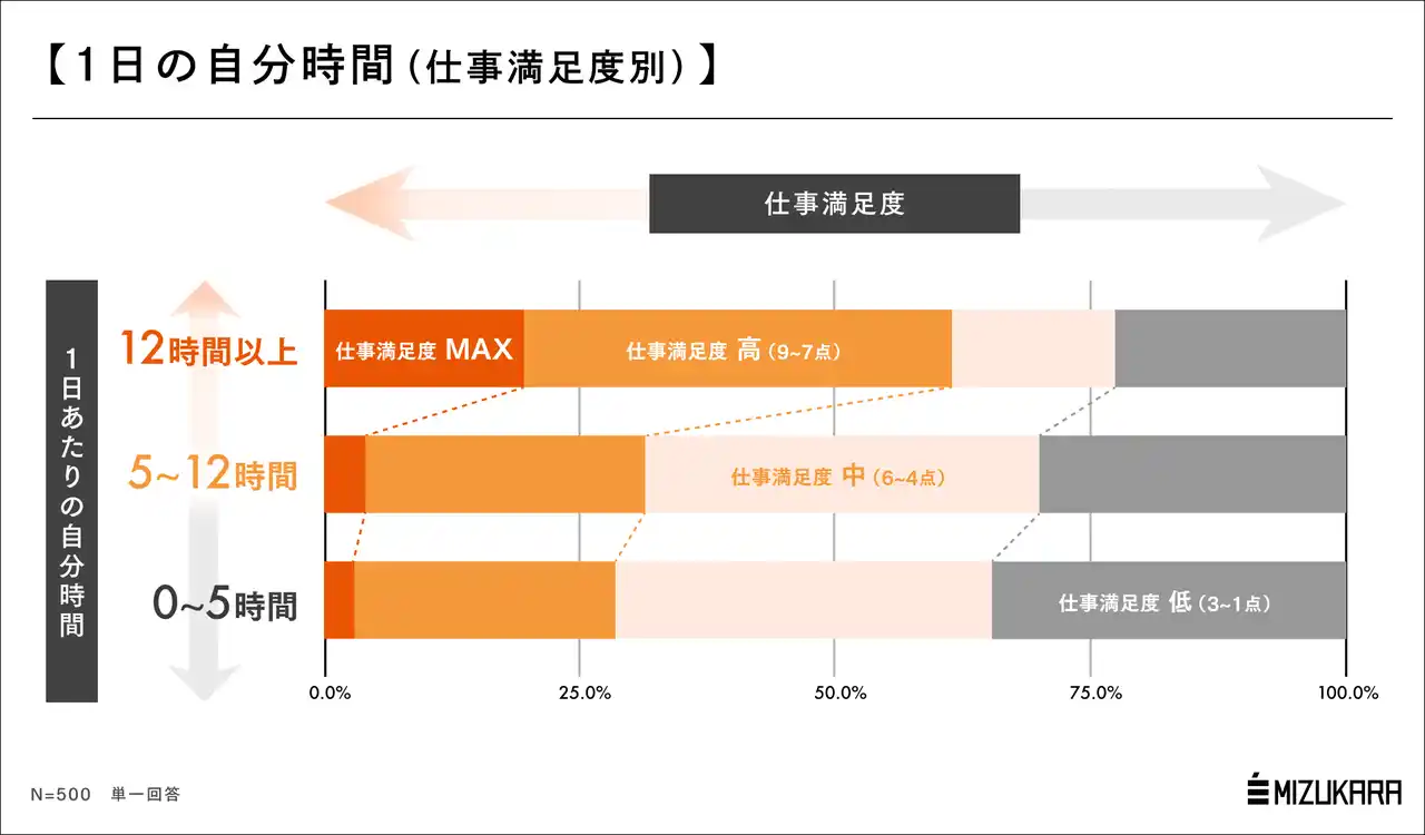 | 認知科学に基づくコーチングを法人・個人に提供する株式会社ミズカラ(本社:東京都千代田区、代表取締役 山宮健太朗)は、2026年2月10日(火)に20歳~59歳の有職男女500名を対象とした「自分時間の量と仕事満足度の相関」調査を行いました。 | |||