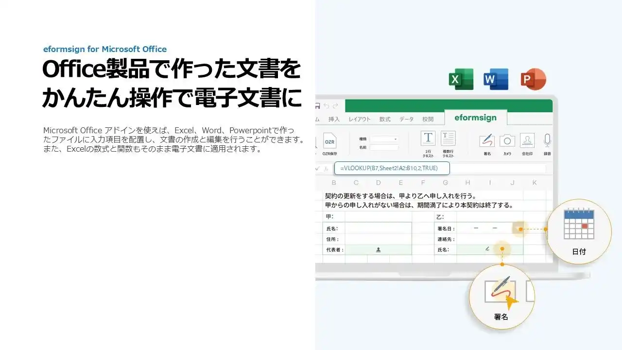 eformsignが提供する「eformsign for Microsoft Office」は、Microsoft Office製品(Excel、Word、PowerPoint)にアドインすることで、MS Office上から直接、入力可能な電子文書を作成・アップロードできる機能です。 |