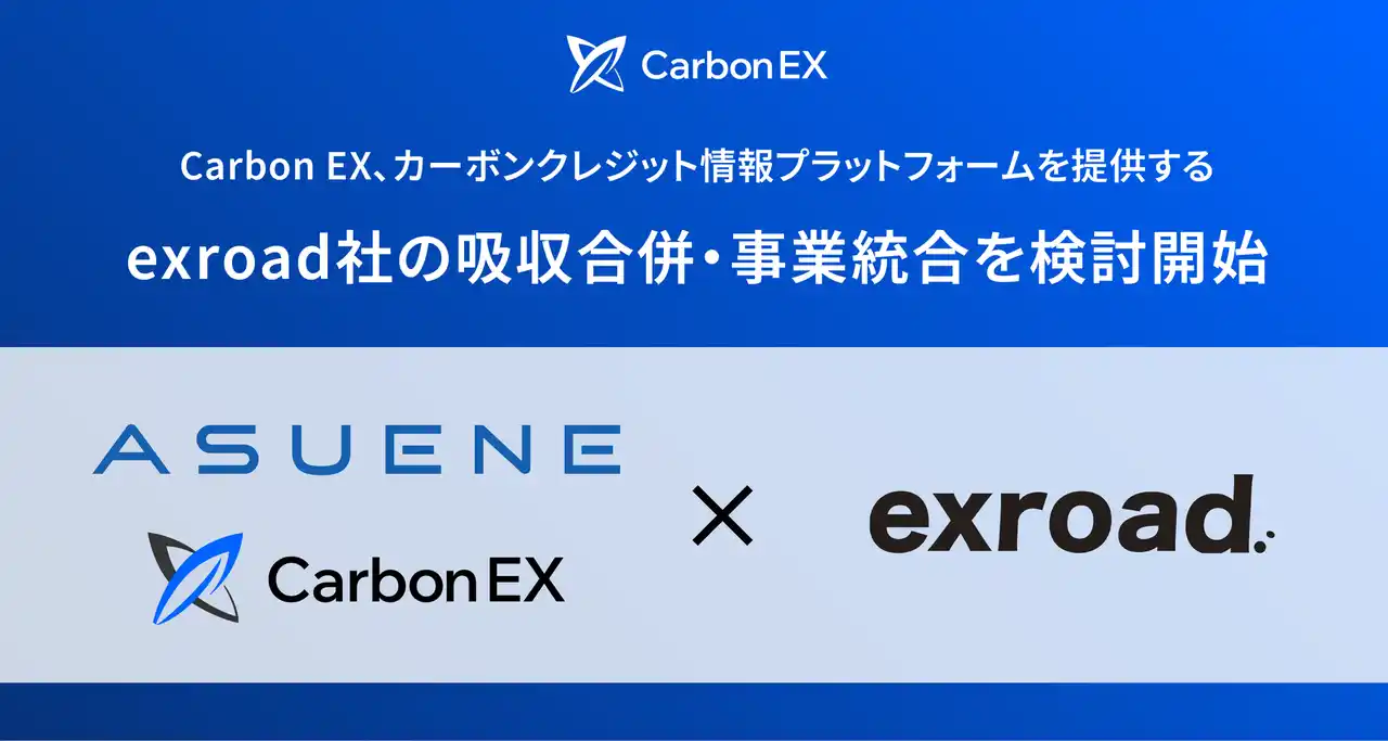 Carbon EX株式会社(本社:東京都港区、代表取締役:西和田浩平、竹田 峻輔、以下「Carbon EX」)は、親会社であるアスエネ株式会社(本社:東京都港区、代表取締役CEO:西和田 浩平、以下「アスエネ」)が、カーボンクレジット領域に特化した情報プラットフォームを展開する株式会社exroad(本社:東京都港区、代表者:木村 圭佑、以下「exroad(エクスロード)」)の100%全株式を取得し、M&Aを実行したことをお知らせします。本件により、exroadはアスエネグループに参画し、今後Carbon EXとexroadとの連携を強化すべく、吸収合併・事業統合の検討を進めていきます。 |