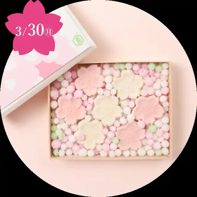 メッセージカードを添えた小箱に、桜の花の口どけのよいお⼲菓子を。 |