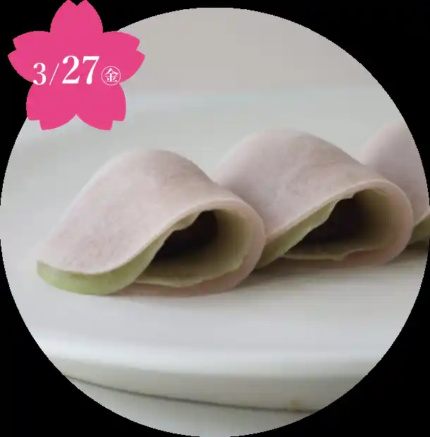 2枚重ねの焼きういろう⽪に桜葉を加え、関東風に。 |