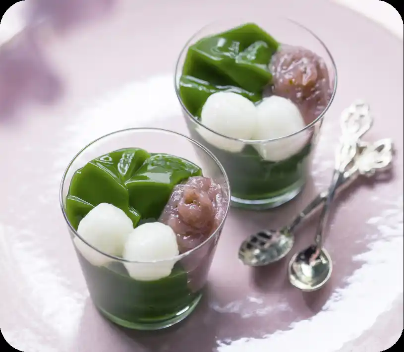 濃厚な抹茶ゼリイに、桜葉の塩漬け入り餡を合わせ、目にも鮮やか。 |