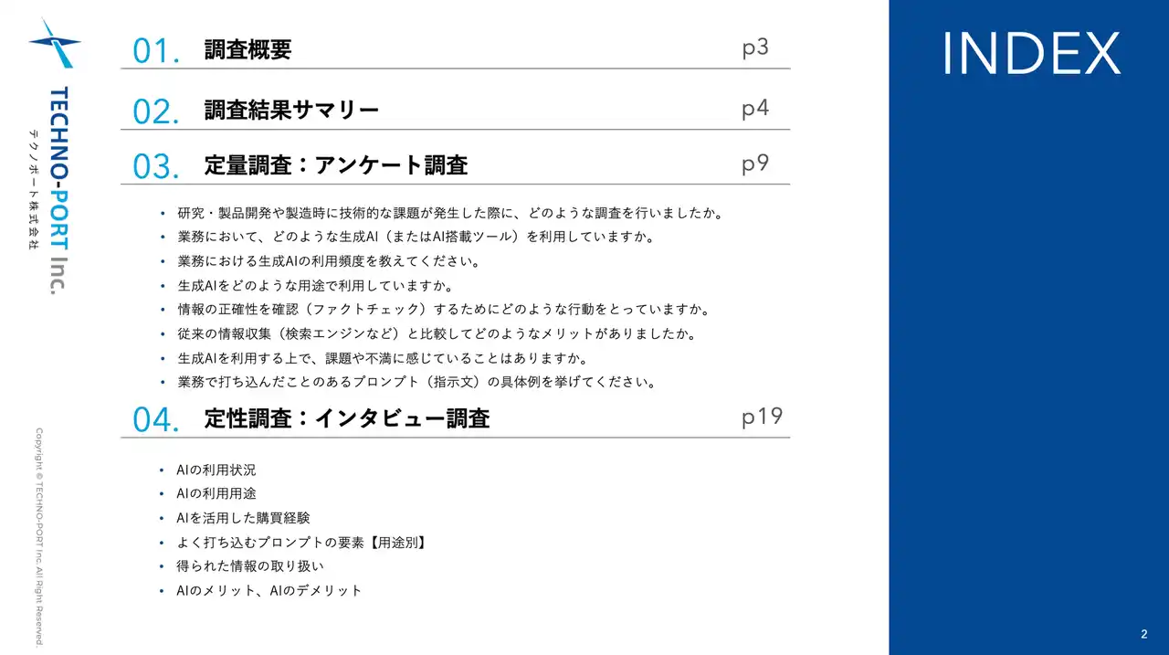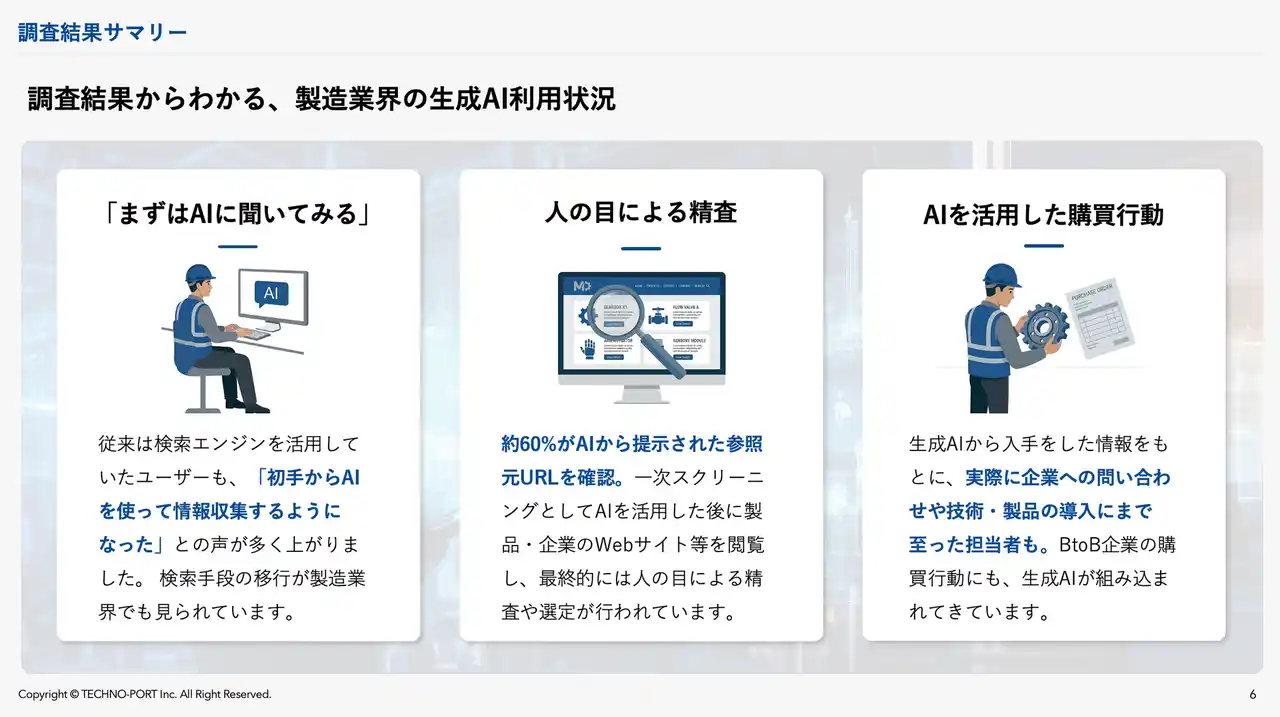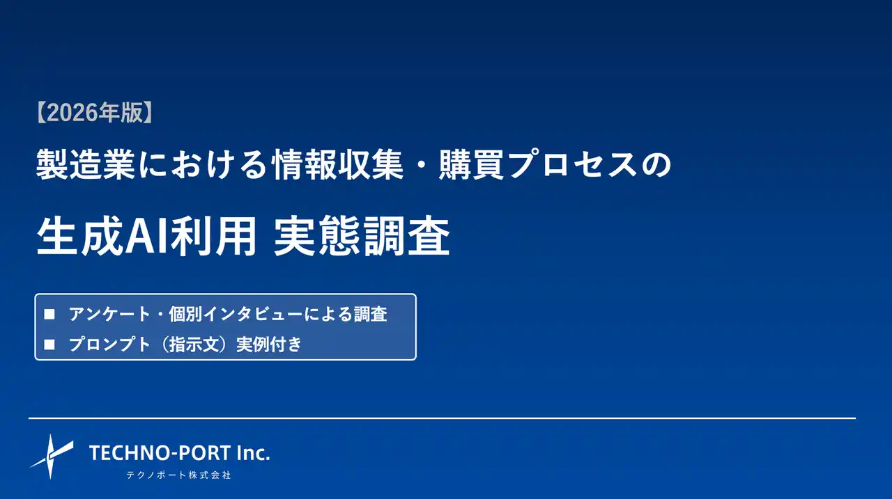製造業向けのWebマーケティングサービスを提供するテクノポート株式会社(本社:東京都港区、代表取締役:徳山 正康)は、製造業における情報収集・購買プロセスにおける「生成AI」の利用実態に関する調査(2026年版)を実施しましたので、お知らせいたします。 |