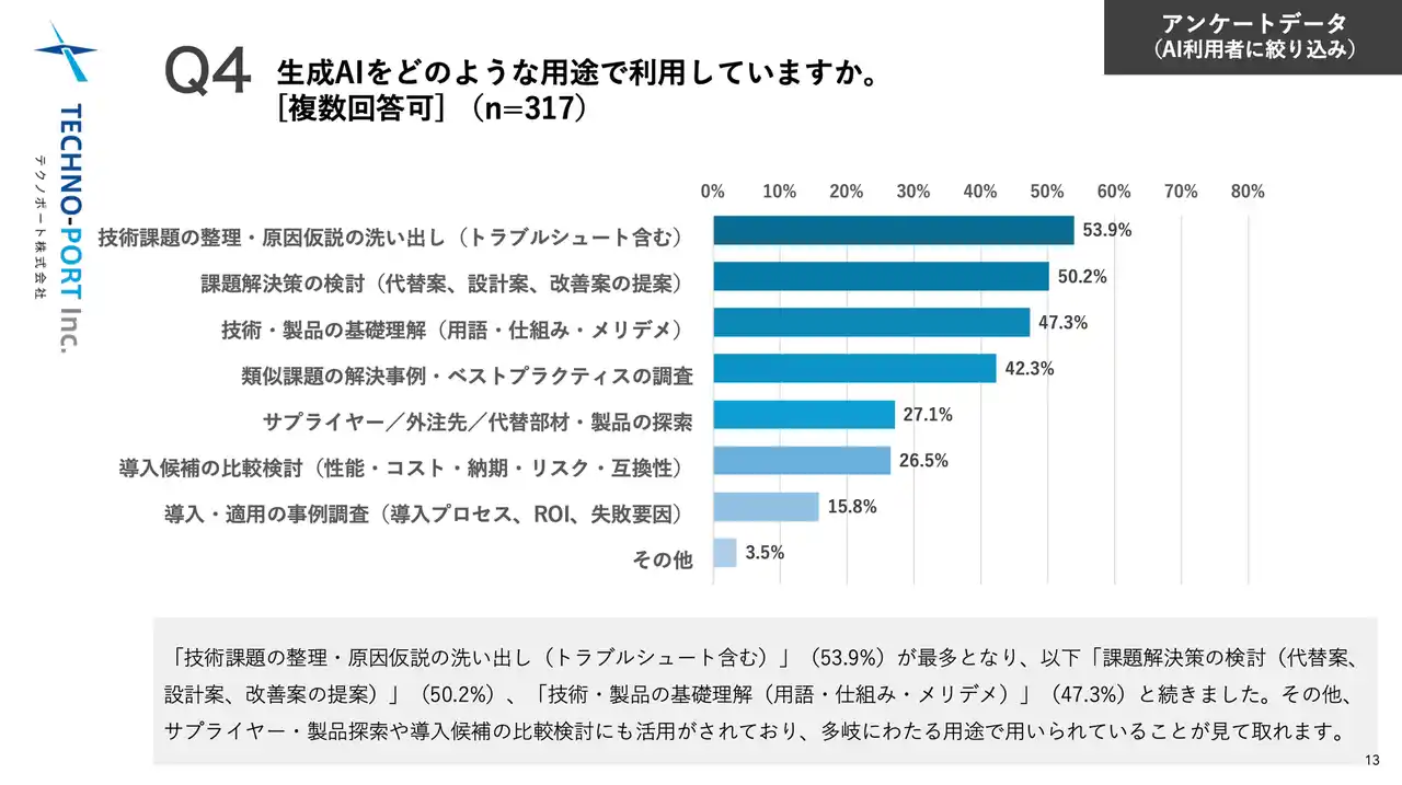 AIの具体的な利用用途としては、「技術課題の整理・原因仮説の洗い出し(53.9%)」や「課題解決策の検討(50.2%)」が上位を占めました。さらに、「サプライヤー/外注先/代替部材・製品の探索(27.1%)」や「導入候補の比較検討(26.5%)」といった購買・調達に直結する用途でも利用されています。 |