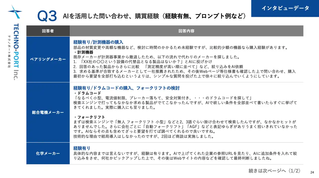 定性調査として実施したインタビューでは、実際に生成AIを活用して製品や技術の問い合わせや導入にまで至った経験について、その当時の流れやプロンプトに関するヒアリングを行いました。生成AIを効率的に用いた情報収集・購買行動が見受けられました。 |