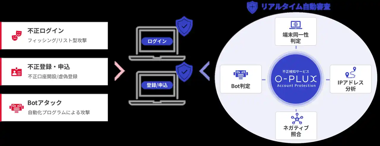Caccoが提供する不正検知サービス「O-PLUX Account Protection」は、「ログイン画面」「登録/申込画面」への「不正ログイン」「不正会員登録/口座開設/申込」「Botアタック」を検知/モニタリングするためのクラウドサービスです。 |