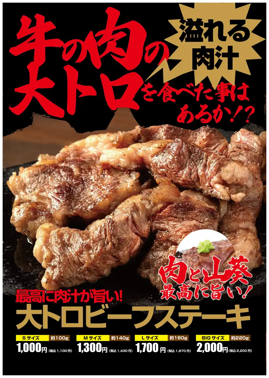 ■「とろけるハラミ」「大トロビーフステーキ」「旨味牛赤身ステーキ」が1000円!! |