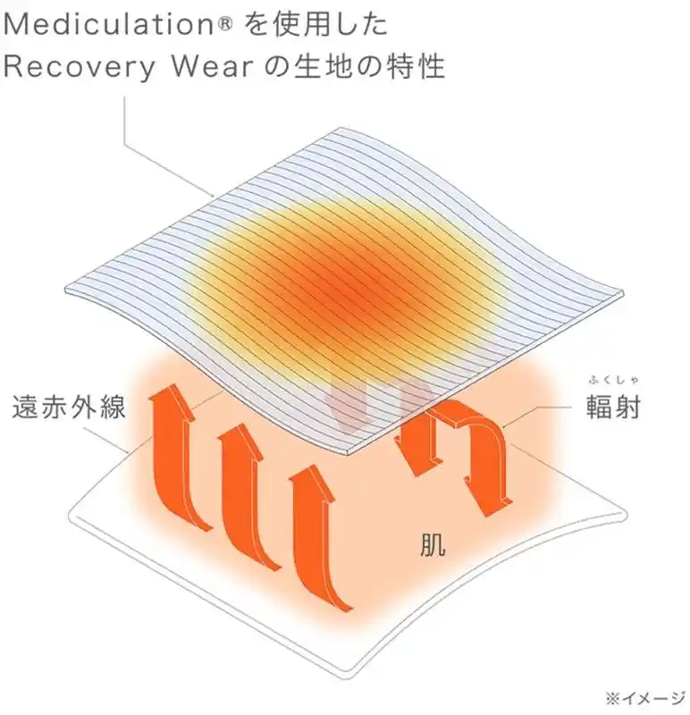 「Mediculation(R)」は、天然鉱石を原料とした高純度セラミックを練りこんだ特殊繊維です。遠赤外線の血行促進作用により疲労回復や筋肉のハリ・コリを緩和します。 |
