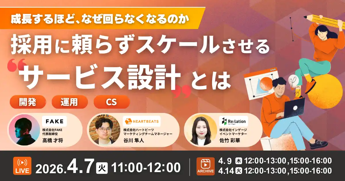 | コミュニケーションプラットフォ-ム「Re:lation(リレーション)」を提供し、6,000社以上(※1)の導入実績を誇る株式会社インゲージ(本社:大阪府大阪市、代表取締役社長:和田 哲也)は、株式会社ハートビーツ、株式会社FAKEとの3社合同ウェビナー「『成長するほど、なぜ回らなくなるのか』採用に頼らずスケールさせる “サービス設計”とは」を2026年4月7日(火)に開催することをお知らせいたします。 | ||||||||||||||