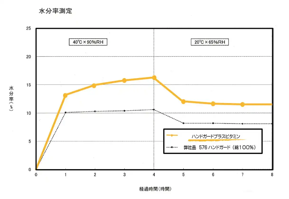 手袋生地保湿効果 弊社従来品576のハンドガード(綿100%)との水分率比較 |