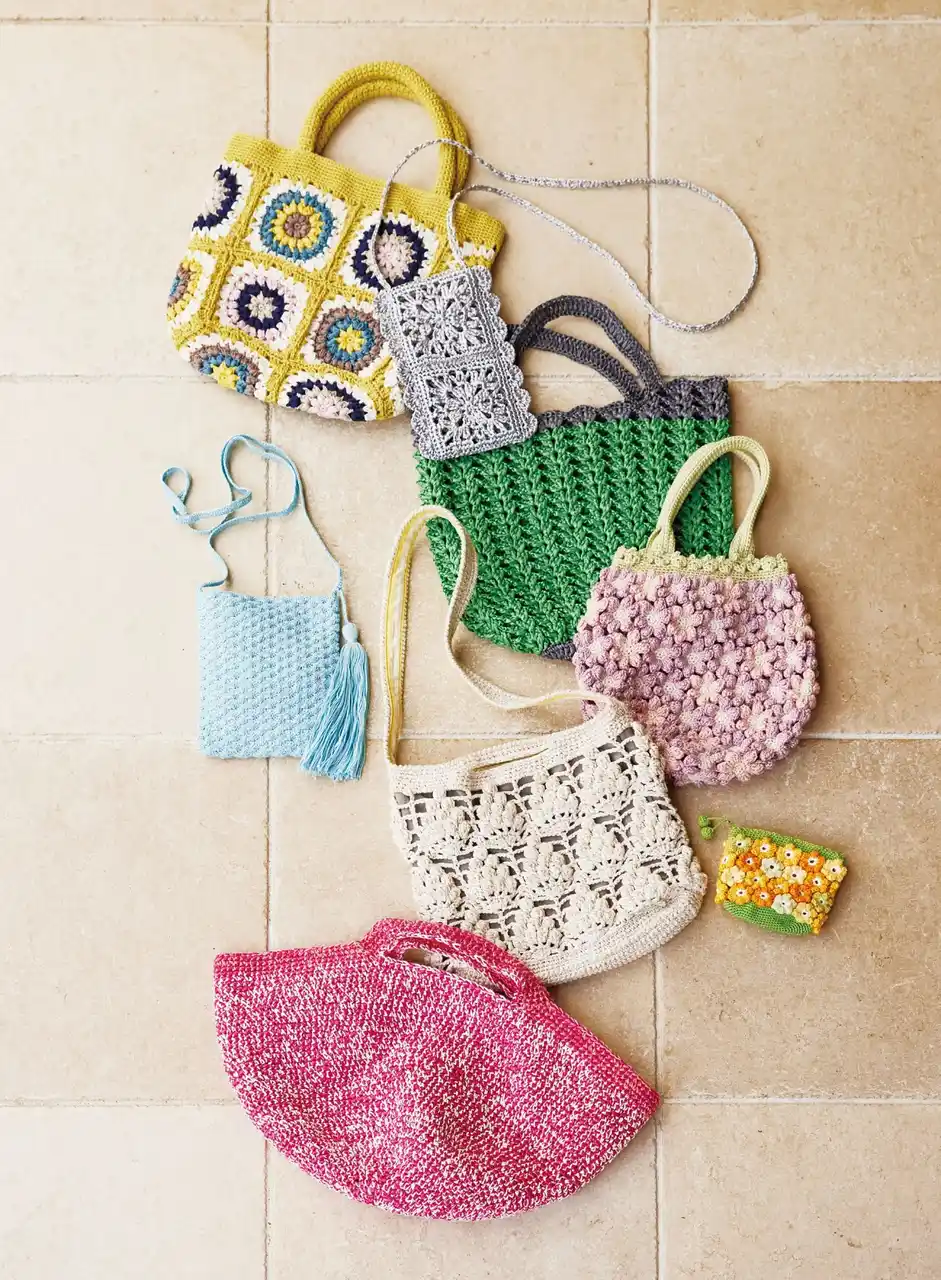 モチーフ編みのバッグや透かし模様の帽子、ストラップやバレッタ、ポーチなどの小物も。楽しく編めて、大人が持ちたいデザインのアイテムを、丁寧な解説つきで紹介します。 |