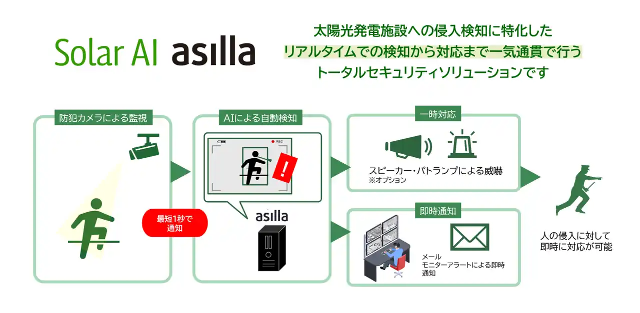 | 「Solar AI asilla」は、AI × 監視カメラ × 威嚇デバイスで万全のセキュリティを実現。 | |||