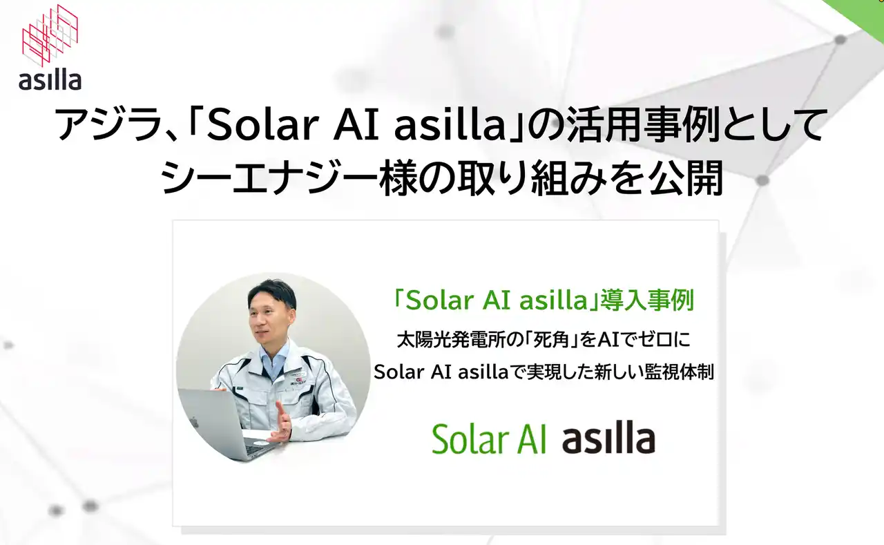 | 株式会社アジラ(本社:東京都町田市、代表取締役CEO:尾上 剛、以下 アジラ)は、太陽光発電所向けAI監視ソリューション「Solar AI asilla」を活用した株式会社シーエナジー(本社:愛知県名古屋市、代表取締役社長:中川 治、以下 シーエナジー)の導入事例を公開しました。 | |||