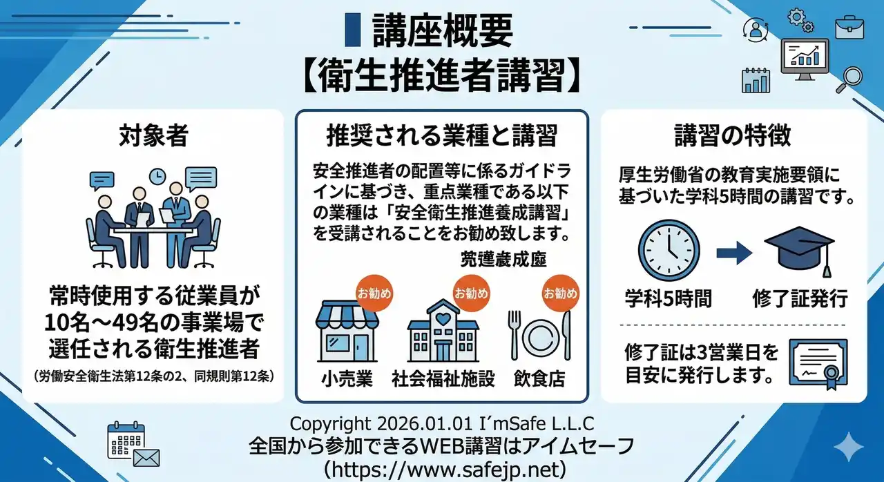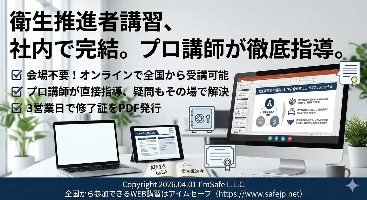 アイムセーフ合同会社では、厚生労働省通達による 【衛生推進者講習】を社内受講できる便利なオンライン講習会で実施しています。 |
