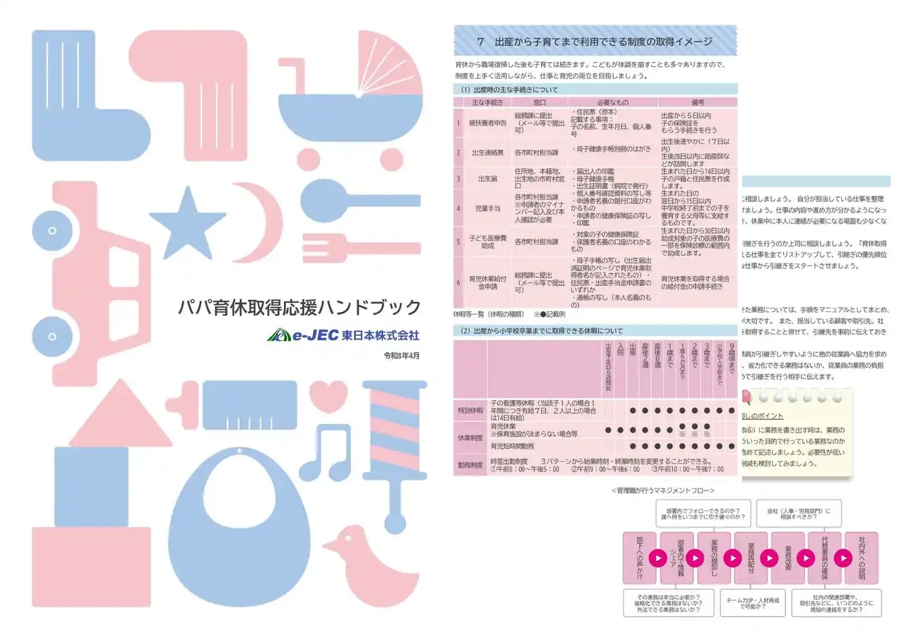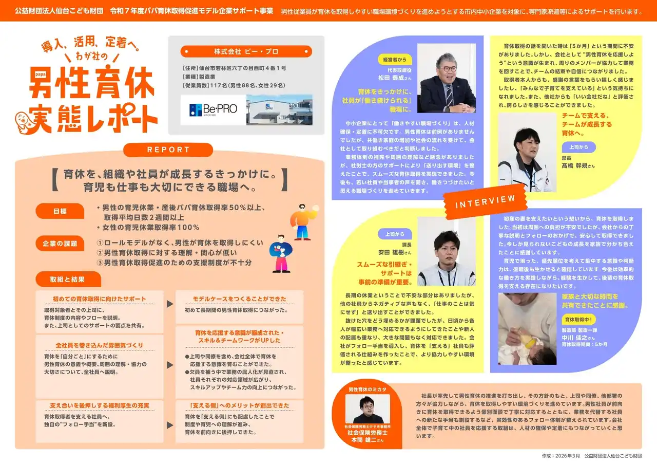 | この事業は、当財団と社会保険労務士などの専門家が、各企業における男性育休を取得しやすい職場環境づくりの取組を支援するもので、このたび、令和7年度に本事業に参加した仙台市内の中小企業3社の取組成果をまとめたレポートを公開しました。 | ||||||||